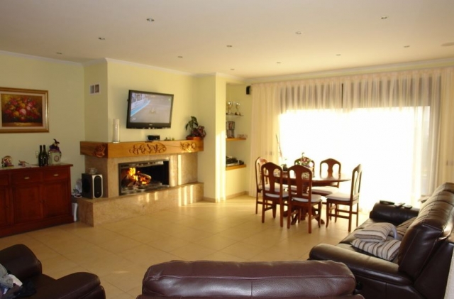plasma devant nous. À côté se trouve la salle à manger avec une table et de nombreuses chaises. Une cuisine ouverte complète, qui communique avec le séjour, avec un plan de travail en forme de U dans...