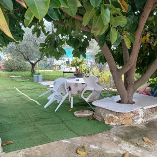 En el exterior, tenemos un porche amplio, con mesa y sillas. Además, vais a disfrutar de un agradable jardín privado, con flores y además, con una zona de barbacoa.