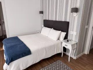 - Una cama de matrimonio grande, con un cabecero tapizado.